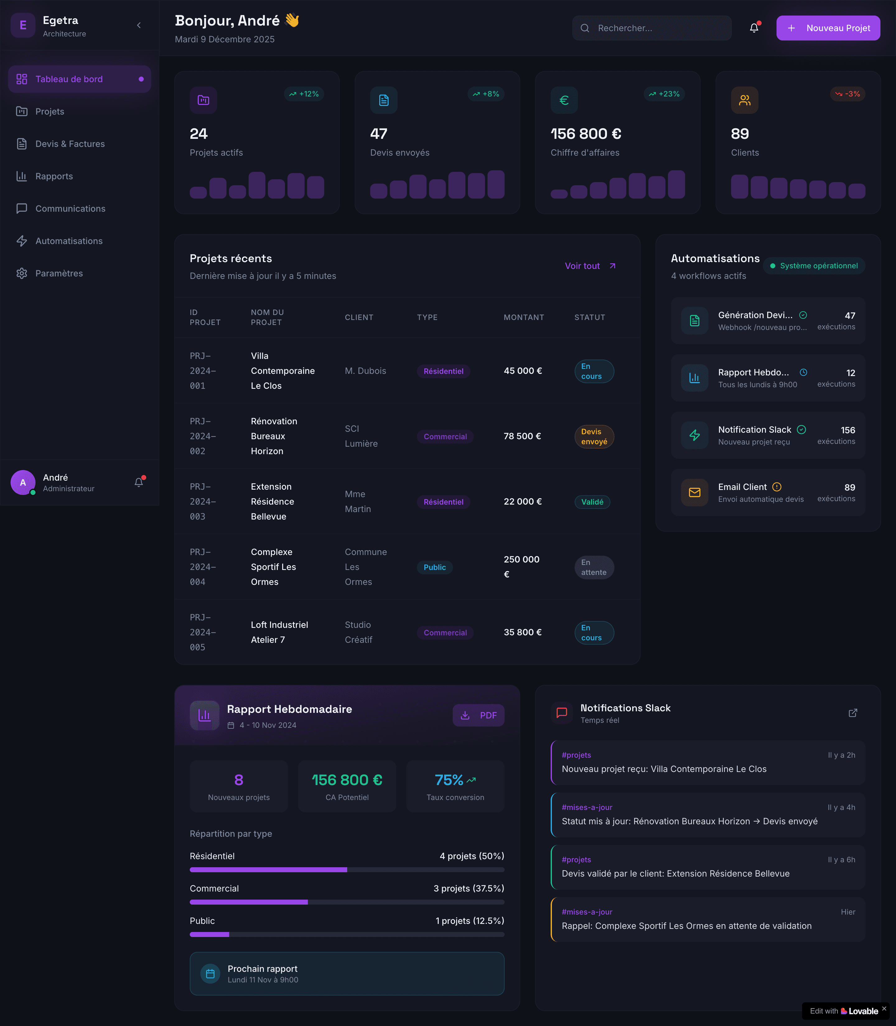 Avant ce workflow n8n, on perdait 3 heures par projet sur l'administratif. Maintenant, dès qu'une demande arrive, le devis est généré et envoyé automatiquement au client en 2 minutes. On a économisé l'équivalent de 2 jours par semaine et nos clients reçoivent leur devis instantanément. L'automatisation nous permet enfin de nous concentrer sur l'architecture plutôt que sur la paperasse !